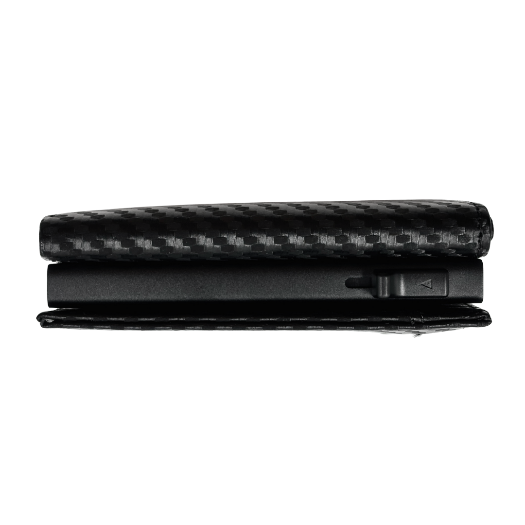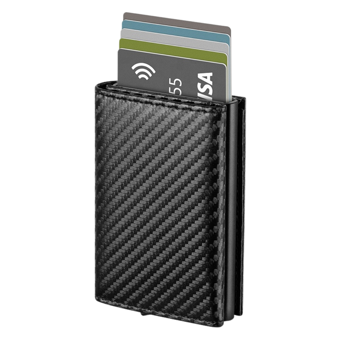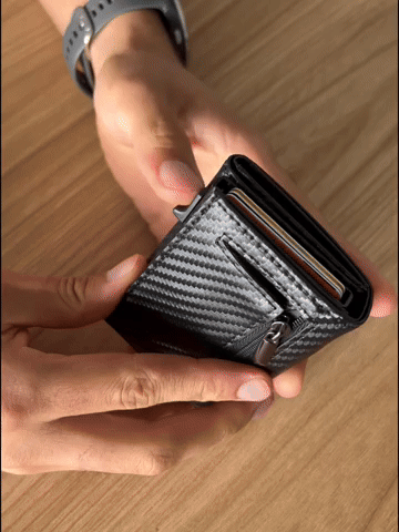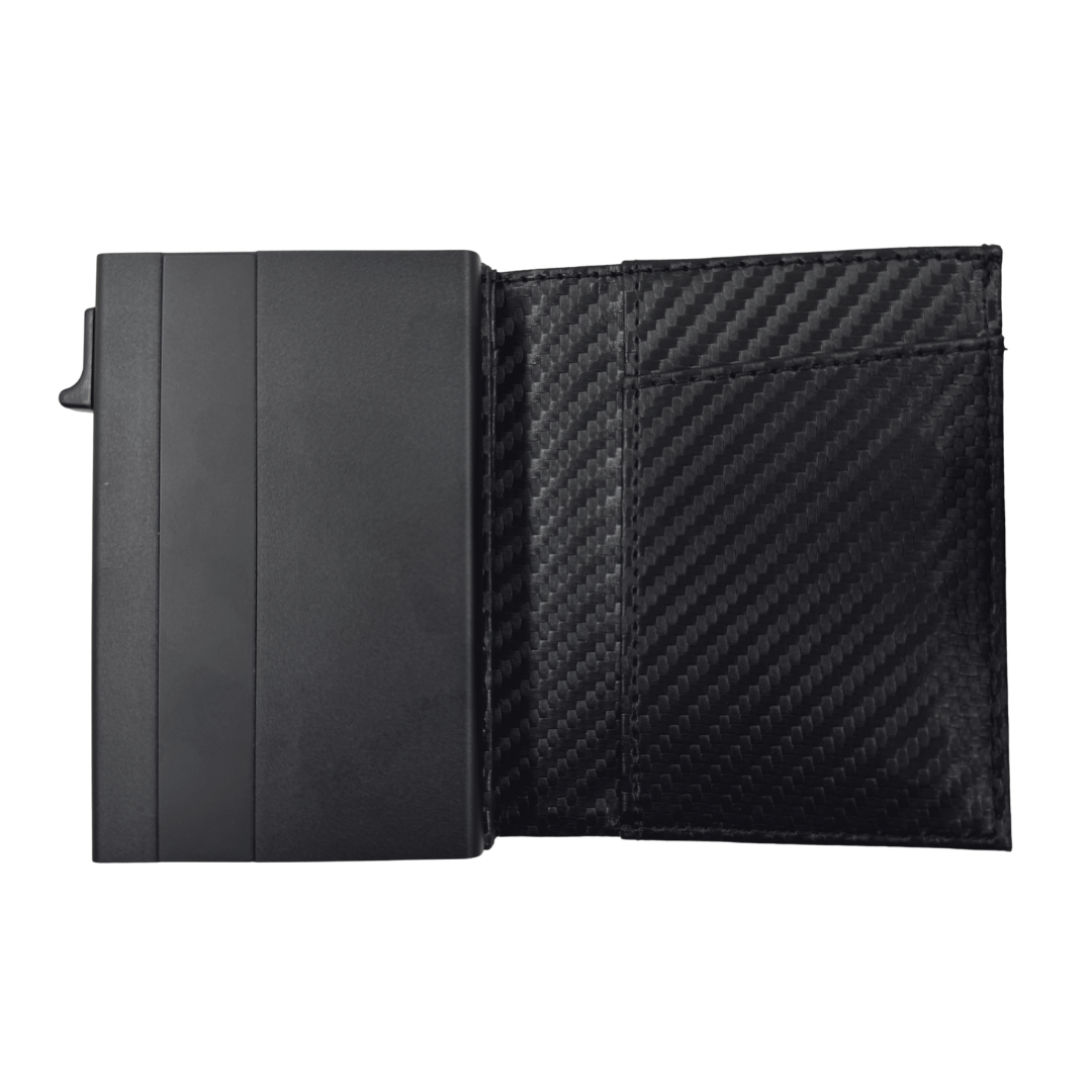 Billetera tarjetera metálica con cubrimiento en cuero vegano y protección RFID anti clonación de tarjetas.